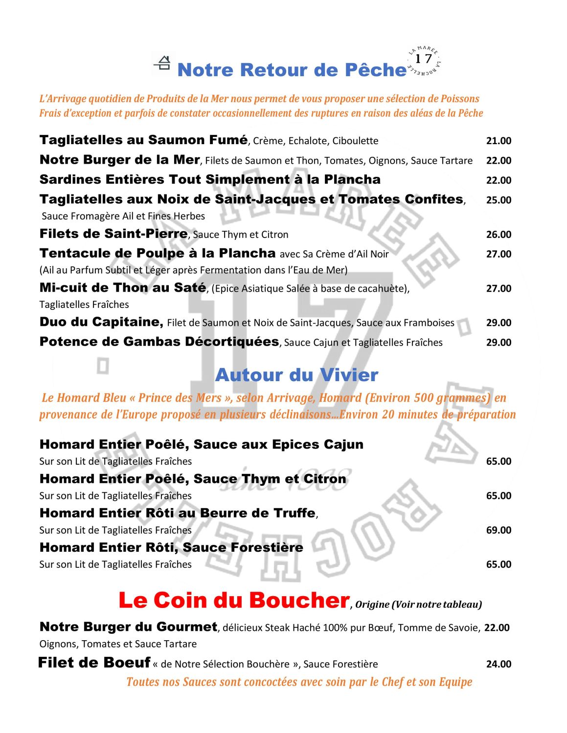 La Marée a su séduire habitués et visiteurs de La Rochelle par la noblesse de ses propositions culinaires, du Homard, Prince des Mers, des Huîtres, Perles de l’Océan, à la déclinaison des richesses de la pêche.