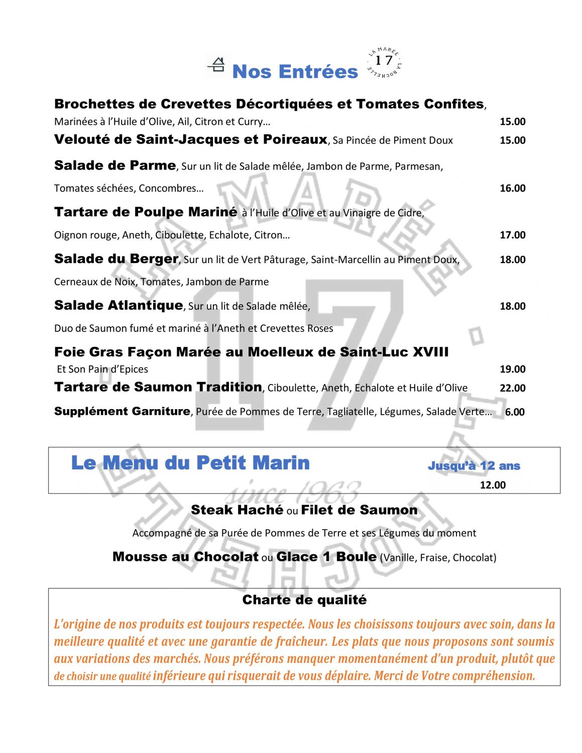 La Marée a su séduire habitués et visiteurs de La Rochelle par la noblesse de ses propositions culinaires, du Homard, Prince des Mers, des Huîtres, Perles de l’Océan, à la déclinaison des richesses de la pêche.
